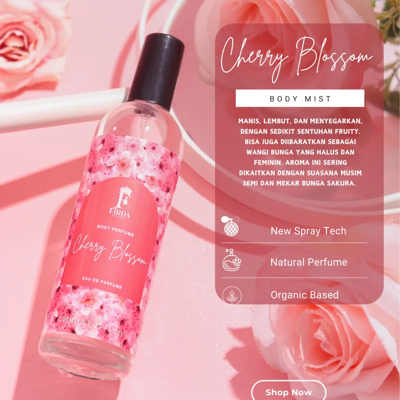 Parfum ini menghadirkan wangi manis, lembut, dan menyegarkan, dengan sentuhan buah-buahan yang halus. Aromanya menyerupai bunga yang feminin dan elegan, mengingatkan pada suasana musim semi dan mekarnya bunga sakura. Cocok untuk Anda yang menyukai kesegaran ringan namun tetap anggun.
