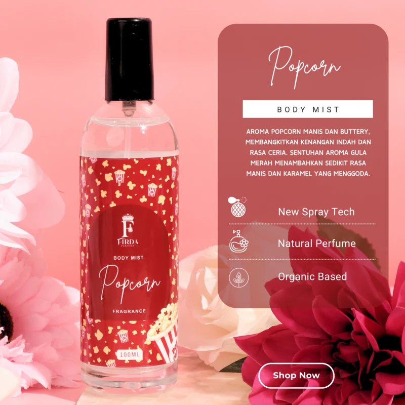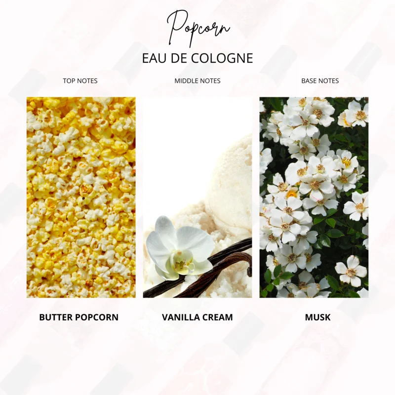 Aroma popcorn manis dan buttery, membangkitkan kenangan indah dan rasa ceria. Sentuhan aroma gula merah menambahkan sedikit rasa manis dan karamel yang menggoda.